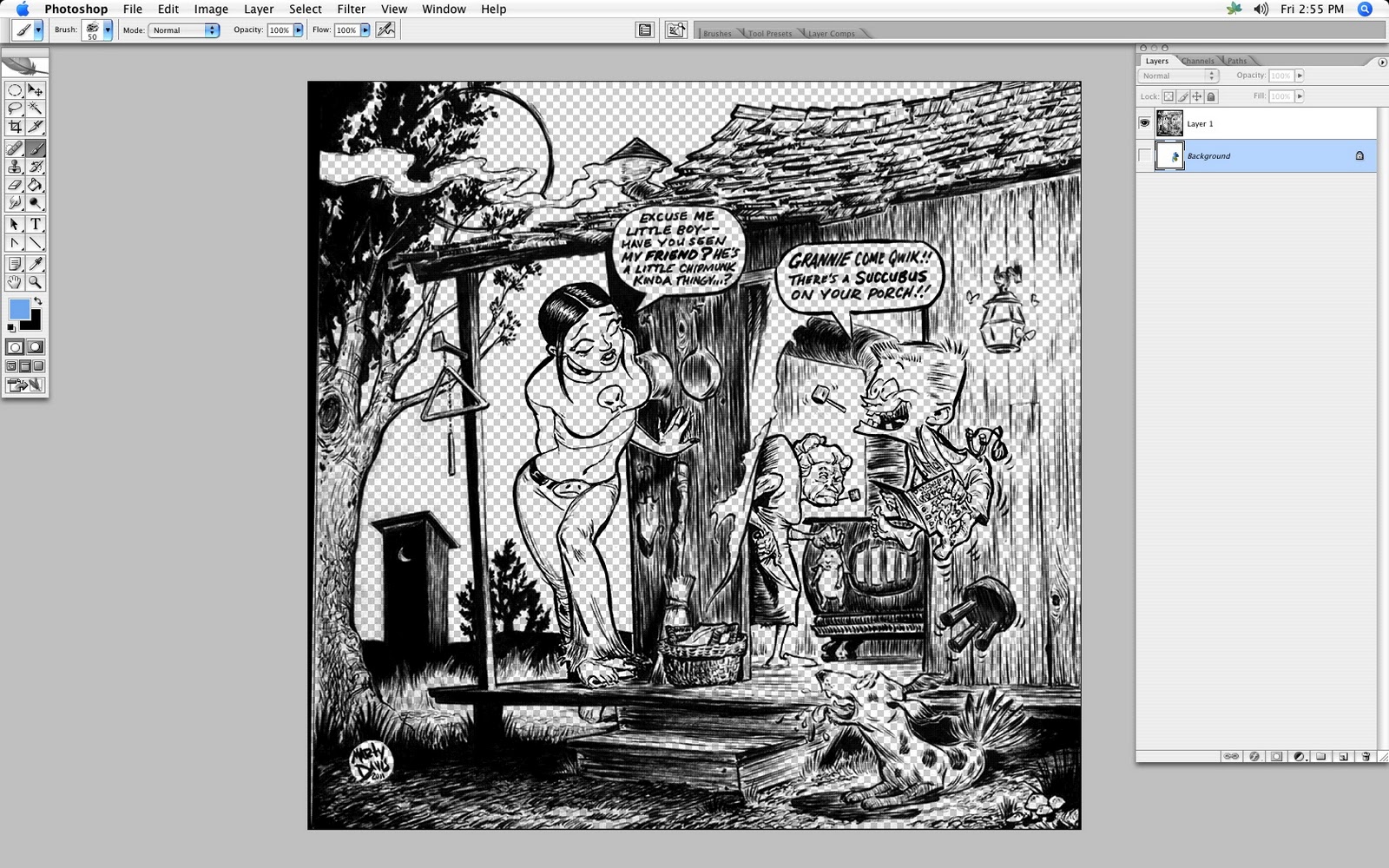 Does anyone have any advice for coloring my Cork tribute page? I am used to doing a primitive sort of coloring in Pho-Sho (Photoshop, 'natch): I push the levels to make my image more Manichean (grays migrate to either black or white--or "black or shite" as I just Freudian-ly typed!!); I make a layer that is just black line, and emptiness (transparency) for the white; under this I add a layer where I make my color shapes. Black lines on top of color blocks, just like inking a cel. Simple, right?